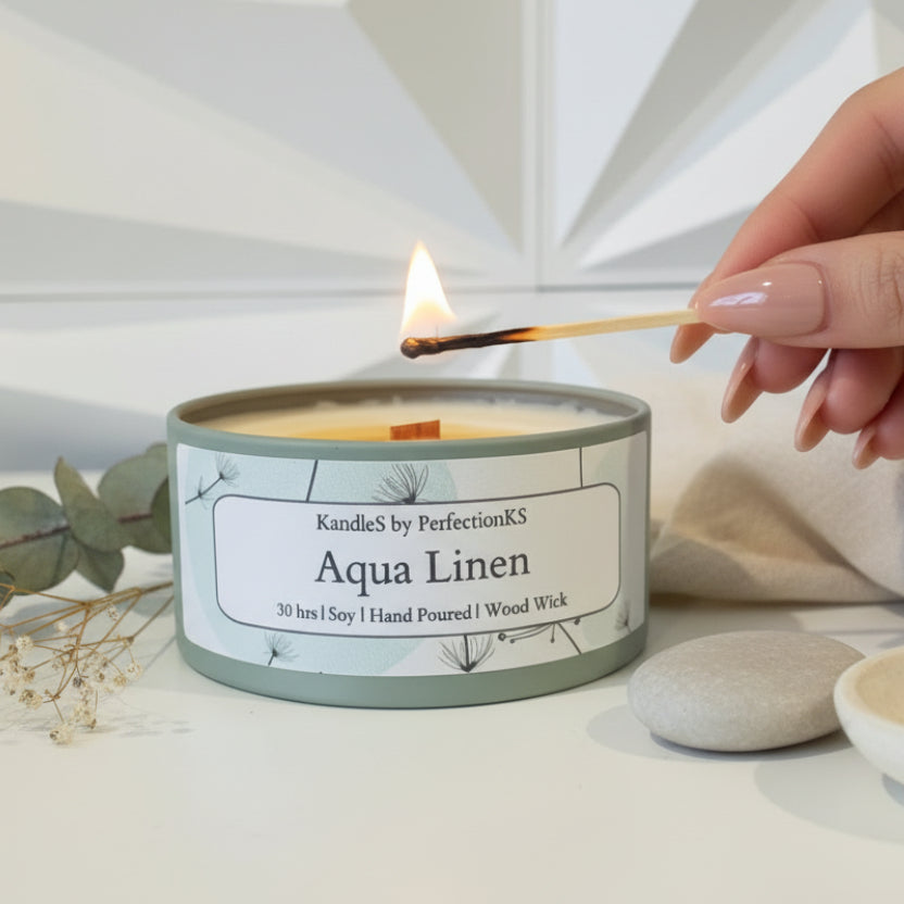 Aqua Linen Luxury Candle | 8oz Non-Toxic Soy Candle with Wooden Wick | Clean Burn